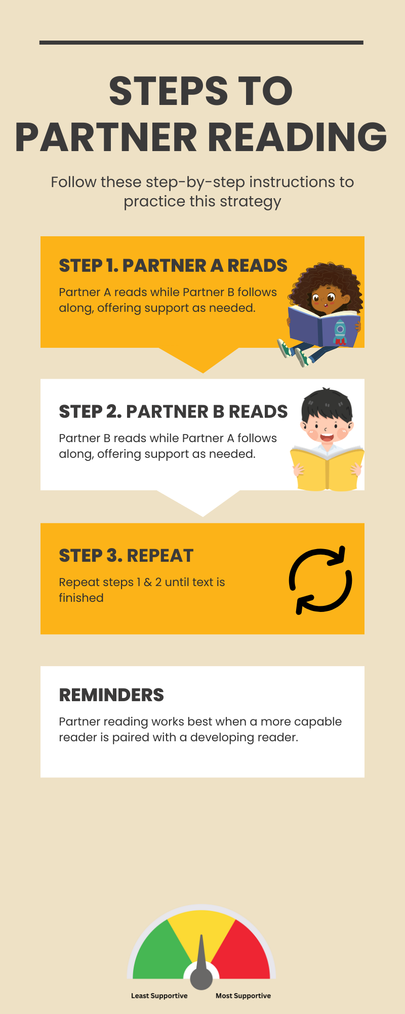 Partner reading provides a moderate level of support, allowing children to gain some independence in their reading while still having the backing of a more capable reader.
