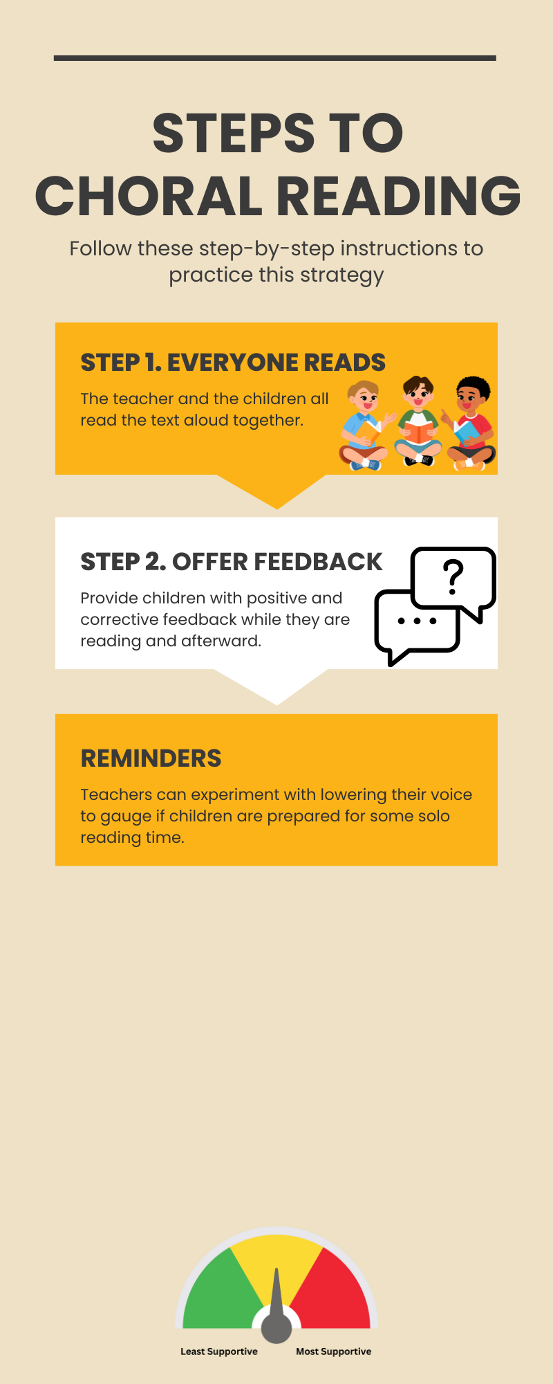 Choral reading offers a moderate level of support, as the child benefits from the reading of their peers while reading the text together in unison.