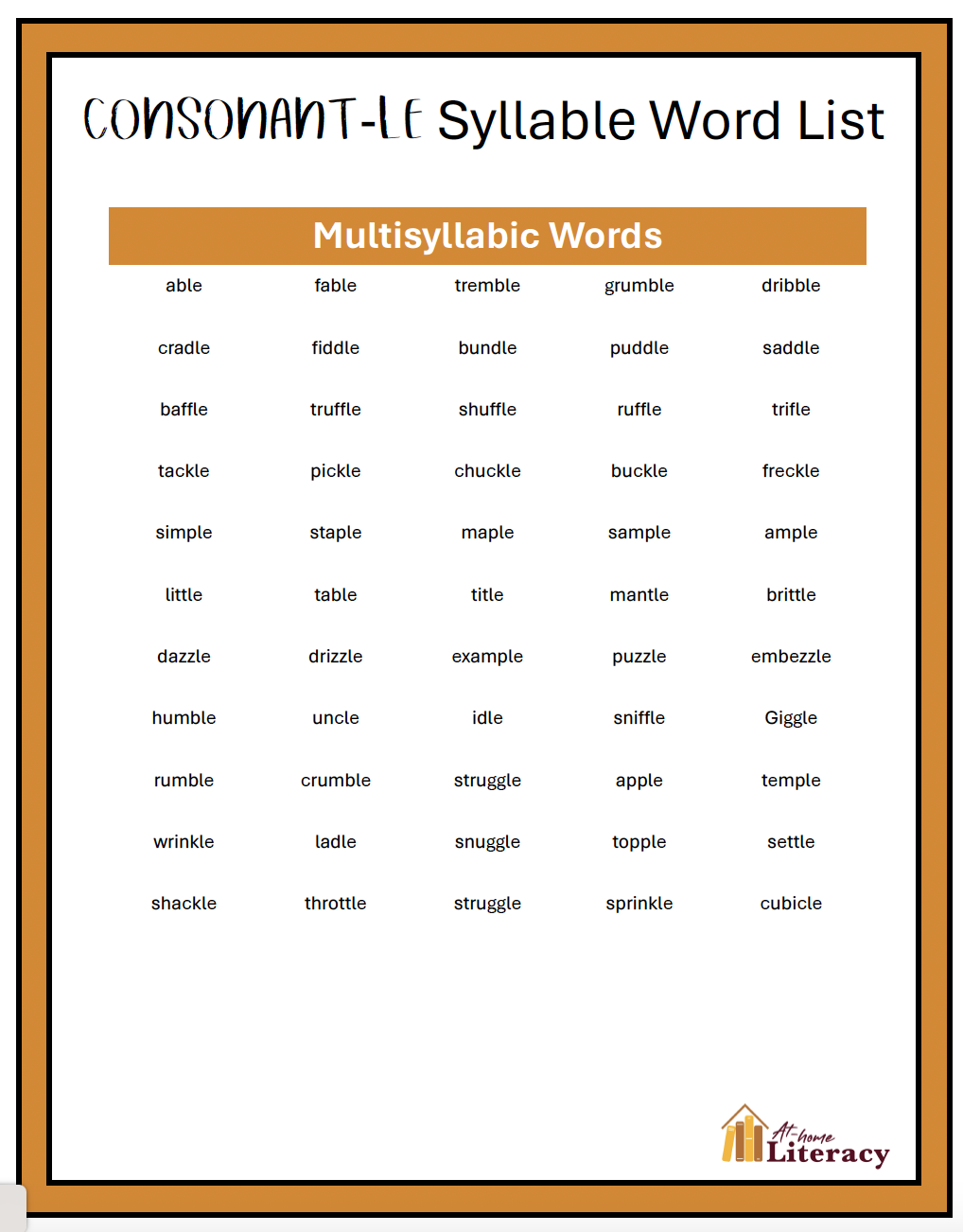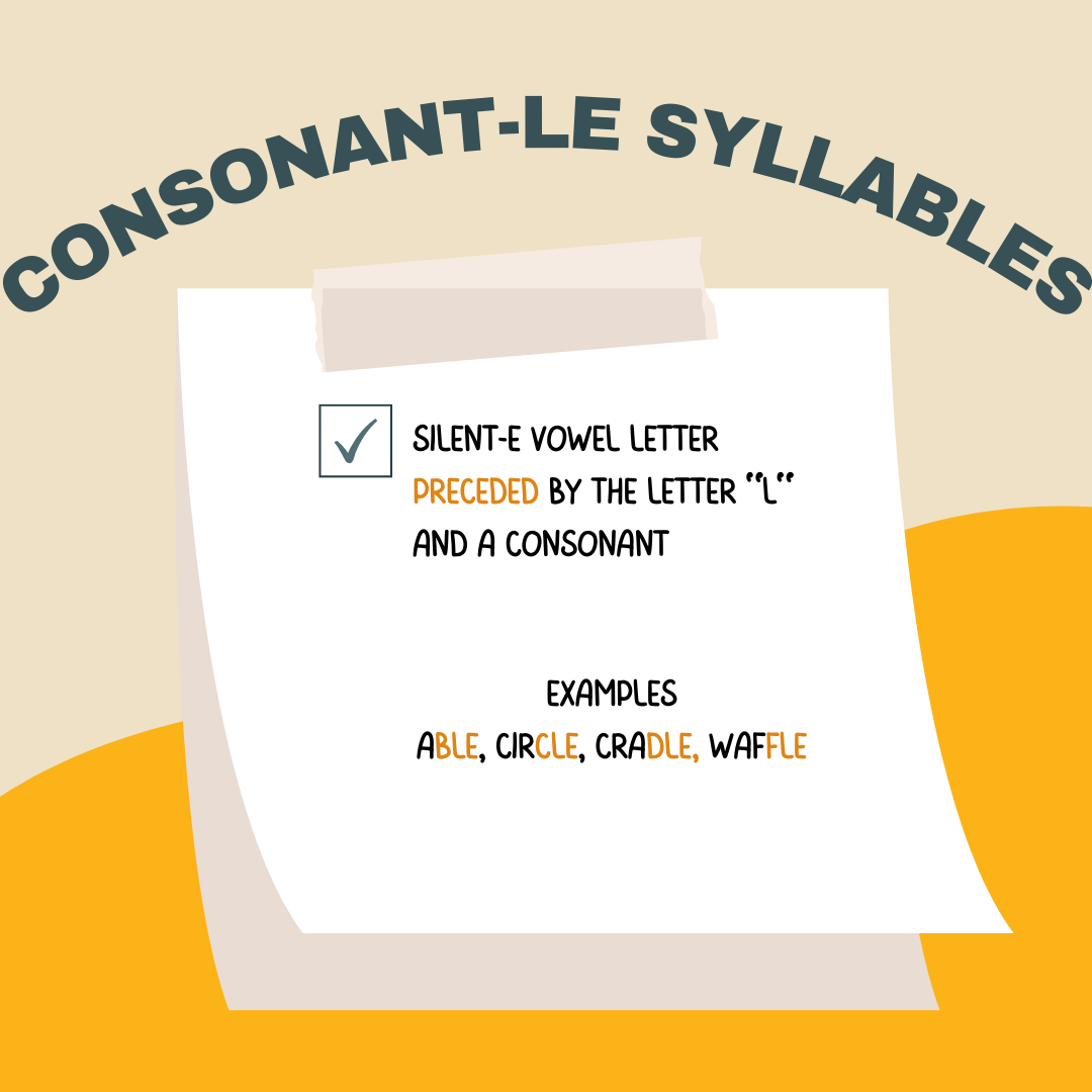 Consonant-le syllables only occur at the end of multisyllabic words, so we need to adjust our routine to look before the vowel instead of after. Even though this syllable type has a vowel letter in it, the only sounds you actually hear are the consonant and the "l." Identifying Syllables Routine This syllable type is typically taught last as it always follows another syllable. Use this word list to help children practice reading consonant-le syllables. Download PDF