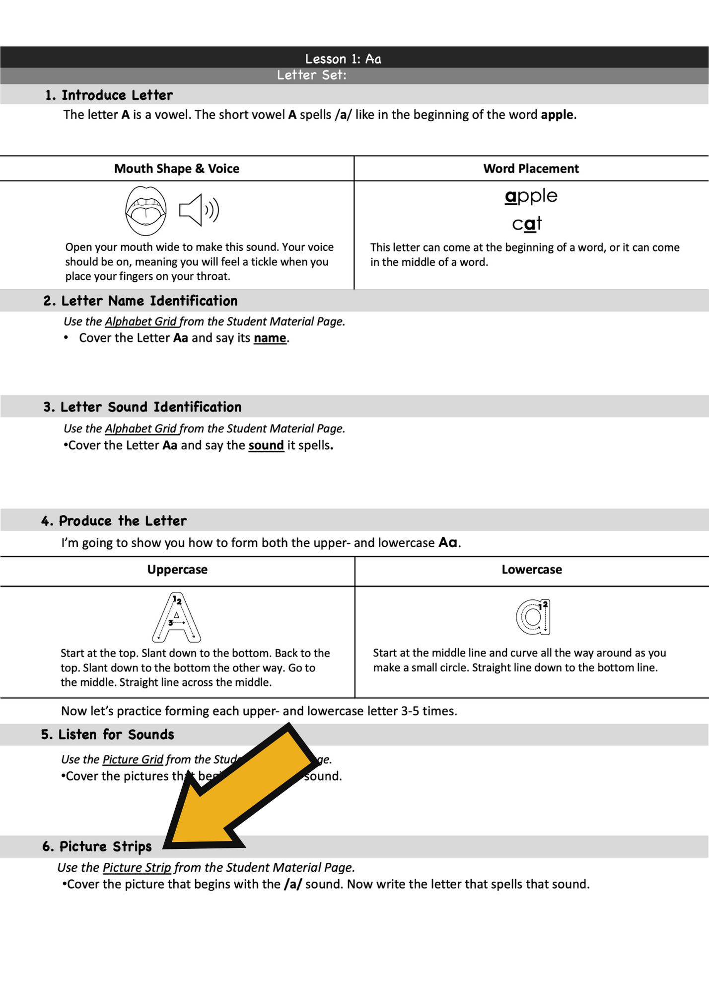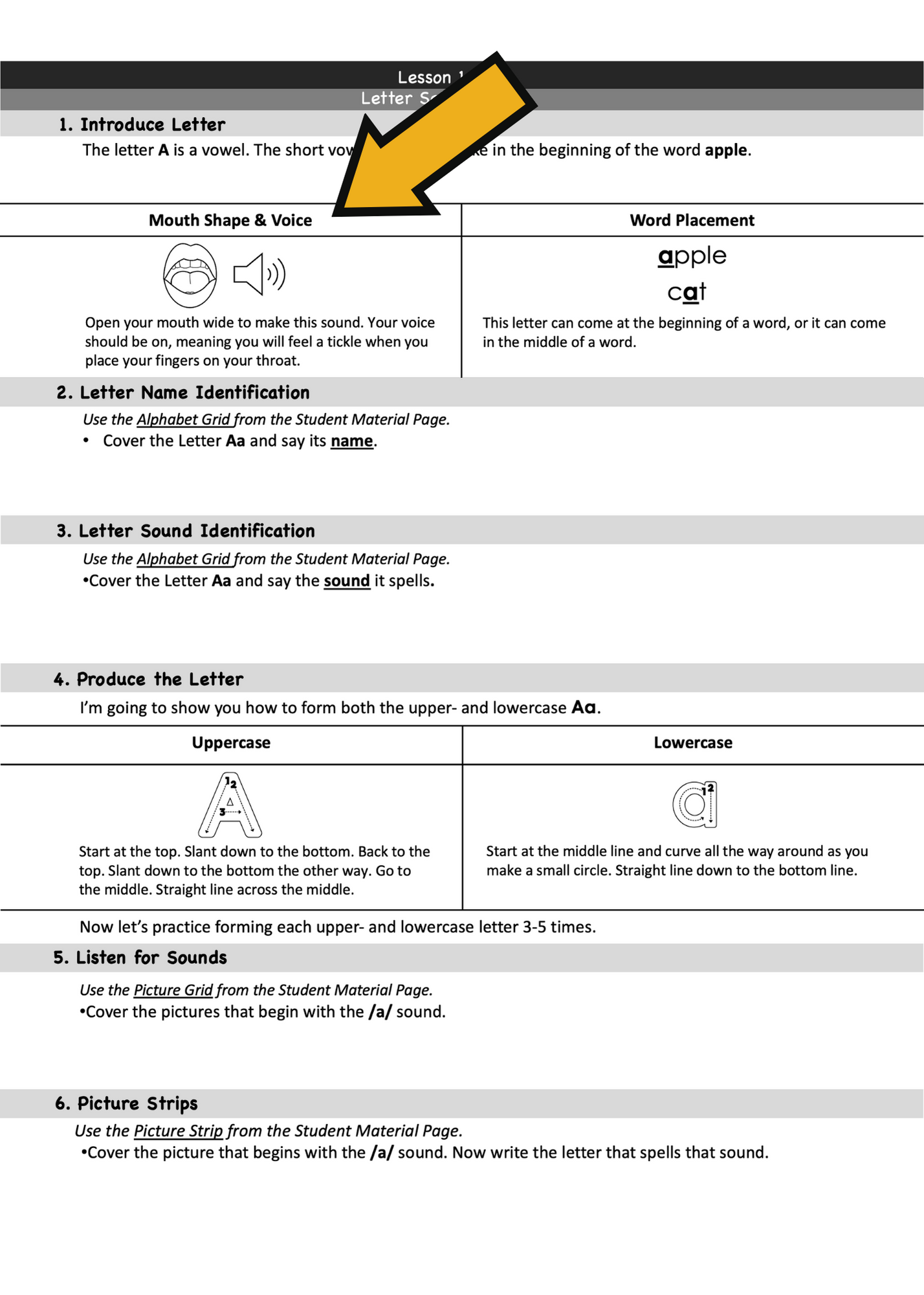 This lesson teaches the letter Aa and its sound. Children learn how to produce the sound, identify words with the sound, and write the letter that spells the sound. Sound awareness and phonics activities are aligned to increase the learning effectiveness. Notice how the lesson strategically progresses from sound activities done in isolation to doing an activity that combines sound awareness and phonics.
